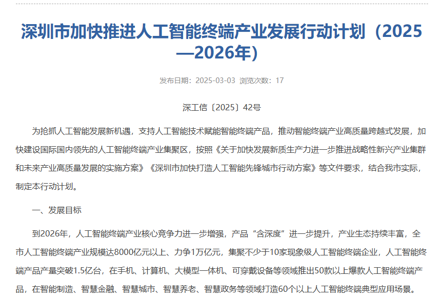 據《行動計劃》提出的發展目標,到2026年,人工智能終端產業核心競爭力進一步增強,產品“含深度”進一步提升,產業生態持續豐富,深圳市人工智能終端產業規模達8000億元以上、力爭1萬億元,集聚不少於10家現象級人工智能終端企業,人工智能終端產品產量突破1.5億台,在手機、計算機、大模型一體機、可穿戴設備等領域推出50款以上爆款人工智能終端產品,在智能製造、智慧金融、智慧城市、智慧養老、智慧政務等領域打造60個以上人工智能終端典型應用場景。