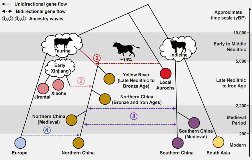 該研究成果顯示,距今約5000年前的新石器時代晚期,普通牛傳入黃河流域並與本土野生原牛發生基因交流;新疆地區的早期家牛受到西亞普通牛和南亞瘤牛的共同影響,自青銅時代晚期至鐵器時代不斷向黃河流域滲透,持續影響了中國北方家牛的遺傳結構。鐵器時代至明清時期,南北方牛群進一步融合,最終奠定了現今中國南北方家牛的基本遺傳框架。(完)