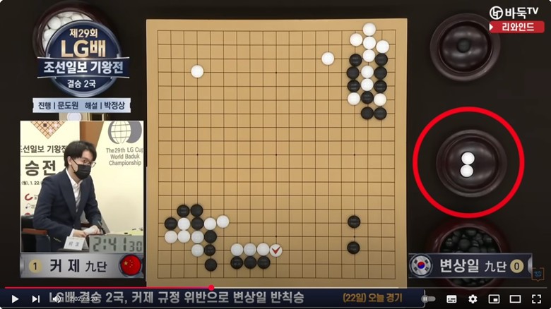 2025年1月22日,第29屆“LG杯世界棋王賽”決賽三番勝負第2局,中國棋手柯潔九段在80手時二度違規,未將提子置於棋盤另一側蓋子裡。圖左上紅圈處為柯潔未放入棋盒蓋的提子(黑子)。賽事網絡視頻截圖